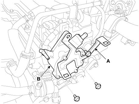 Снимите кронштейн проводки (А), а затем снимите вакуумный насос (В).