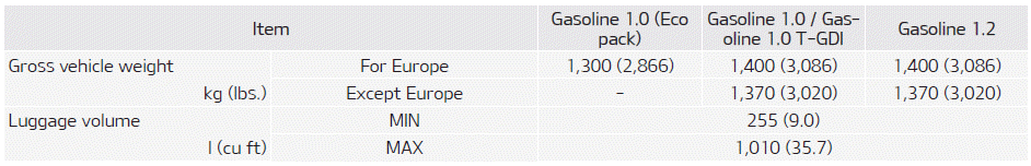 Kia Picanto: Технические характеристики и информация для потребителей / Масса/Объем, Система кондиционирования воздуха
