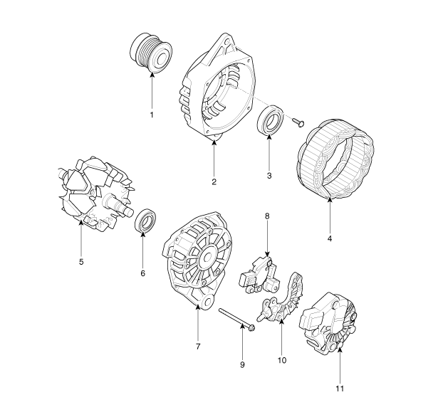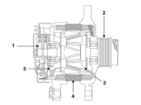 2. Шкив генератора с обгонной муфтой (OAP) 3. Ротор 4. Статор 5. Выпрямитель |
