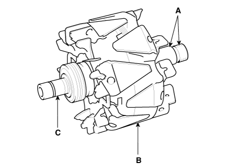 Убедитесь в отсутствии непрерывности между контактными кольцами и ротором. (B) или вал ротора (C).