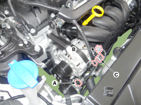 Отсоедините разъем воздушного компрессора (А) и разъем генератора. (B) и отсоедините кабель (C) от клеммы «B» генератора.