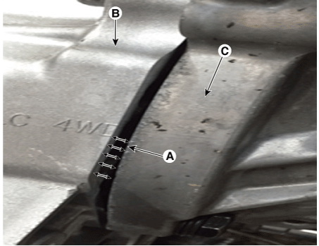 Снимите трос переключения передач (В), предварительно ослабив гайку (С) и болты (А).