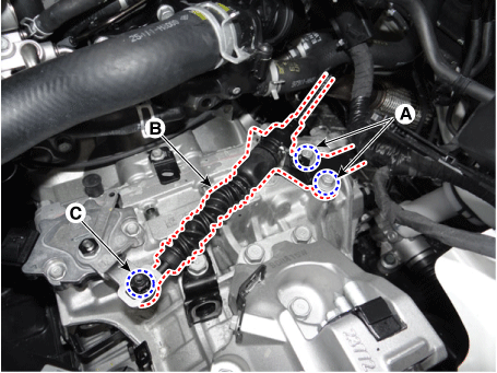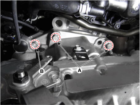 Снимите болты верхнего крепления коробки передач (А) и крепление стартера. болты (В).