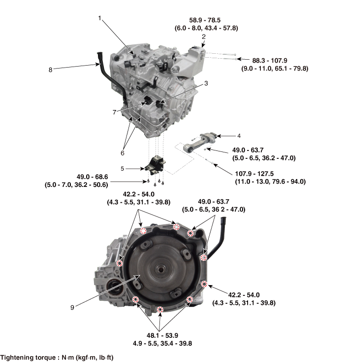 6. Трубка охладителя ATF 7. Основной разъем 8. Заливная трубка ATF 9. Гидротрансформатор |