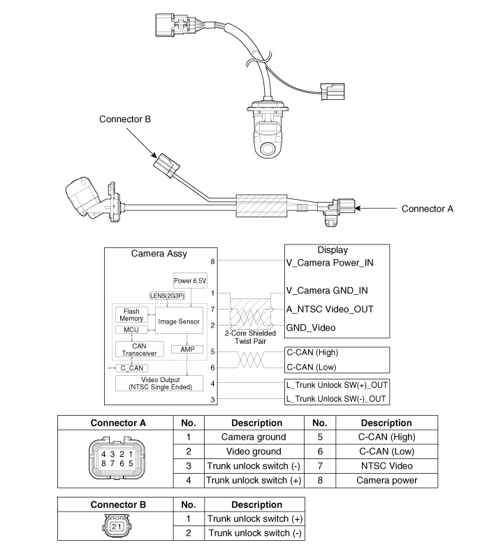 Чтобы отобразить заднюю часть автомобиля, чтобы помочь водителю, он получает сигнал заднего изображения с камеры заднего вида и отображает его на головке AVN блок монитора или левое внутреннее зеркало заднего вида. |