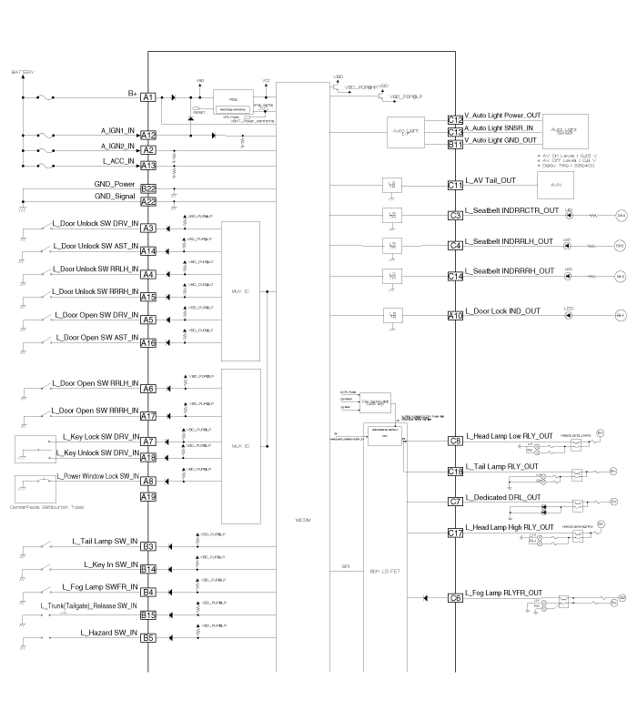 Если значение датчика автоматического освещения ниже условия включения заднего фонаря (0,4 В) в режиме ACC ON выход заднего фонаря AV включается после 1 секунда.