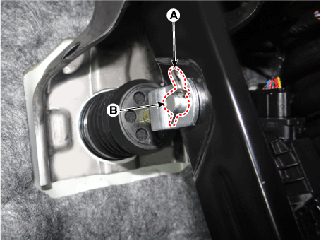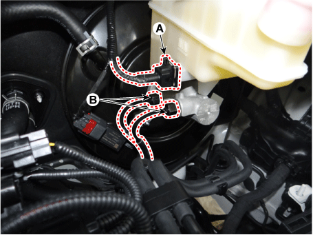 Отсоедините разъем выключателя уровня тормозной жидкости (А) и отсоедините тормозную трубку (B) от главного цилиндра, ослабив развальцовку трубки орех.