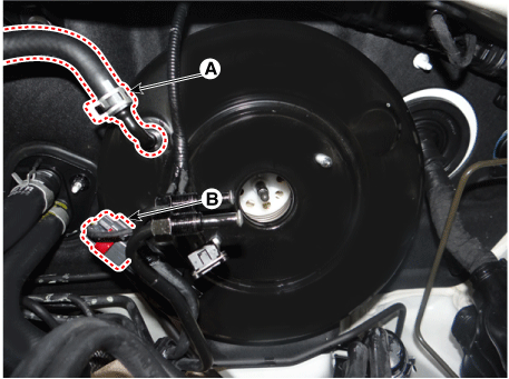 Снимите усилитель тормозов после отсоединения вакуумного шланга (А) и ISG. соединитель (В).