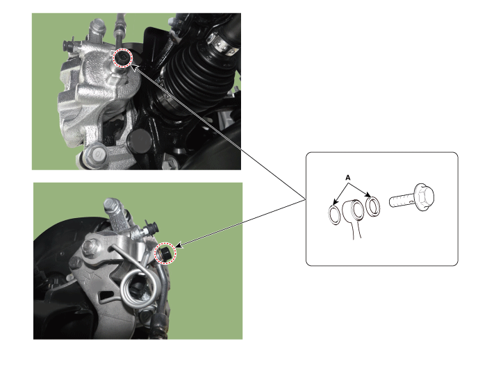 Отсоедините тормозной шланг от тормозного суппорта, ослабив болт (А).