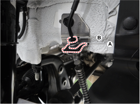 Отсоедините тормозную трубку, ослабив накидную гайку трубки (В).