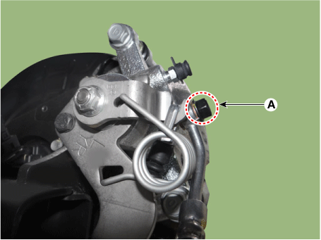 Ослабьте винт для прокачки правого заднего тормоза (А), чтобы воздух вышел из система. Затем надежно затяните прокачной винт. Передний