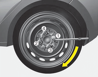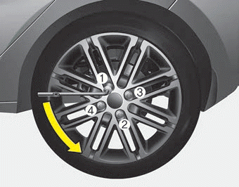 Обойдите колесо, затягивая каждую гайку в соответствии с показанной числовой последовательностью. на изображении, пока они не будут тугими. Затем дважды проверьте затяжку каждой гайки. После замены колес, обратитесь к авторизованному дилеру Kia затяжкой колесных гаек до упора. правильный крутящий момент как можно скорее.