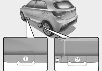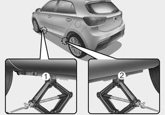 7. Поместите домкрат в переднее (1) или заднее (2) положение домкрата, ближайшее к шину вы меняете. Установите домкрат в предусмотренных местах под рамой. Позиции домкрата представляют собой пластины, приваренные к раме с двумя выступами и выступом. точка для индексации с домкратом.