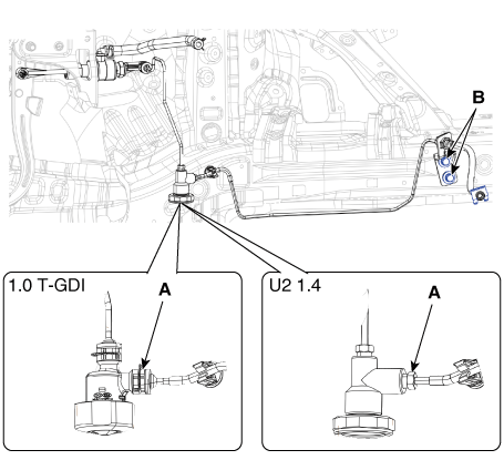 Снимите воздушный фильтр в сборе. D 1.4 U2 TCI (см. Механическая система двигателя — «Воздушный фильтр») G 1.0 T-GDI (см. Механическая система двигателя — «Воздушный фильтр») |
