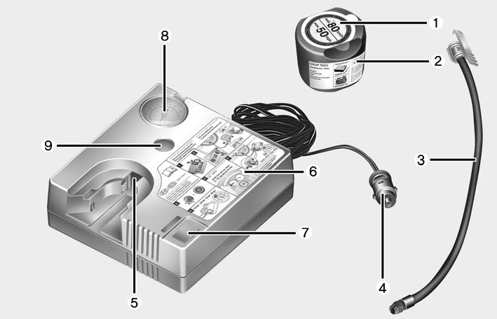 Перед использованием комплекта для ремонта шин внимательно прочтите прилагаемую инструкцию. на корпусе герметика. Отсоедините этикетку ограничения скорости на корпусе герметика и положите ее на хорошо видном месте. Всегда двигайтесь в пределах установленной скорости.