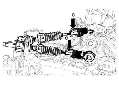 Снимите фиксатор троса переключения передач (А) после ослабления гаек (В). Затем, снимите трос переключения передач, потянув его в сторону салона автомобиля.