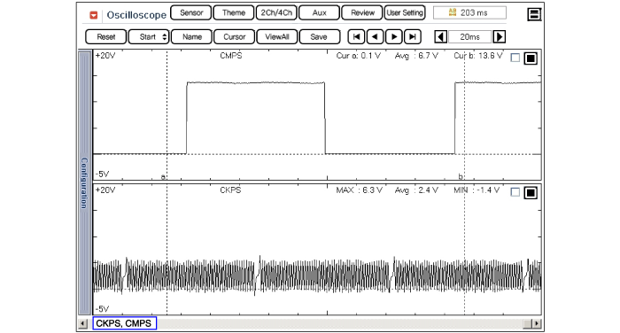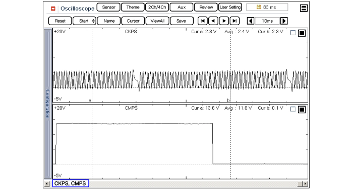 Проверьте форму сигнала CKPS и CMPS с помощью диагностического прибора.