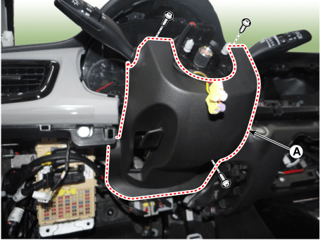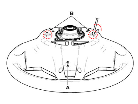 Поворачивая руль влево и вправо, нажмите на части, отмеченные A (3 красных пунктирных круга) под рулевым колесом, а затем снимите подушку безопасности. модуль.