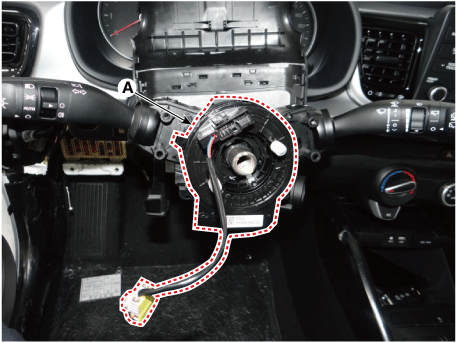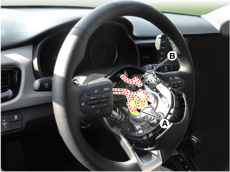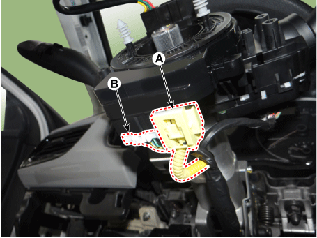 Отсоедините разъем жгута проводов часовой пружины (A) от проводки звукового сигнала разъем жгута проводов (B) в часовой пружине.