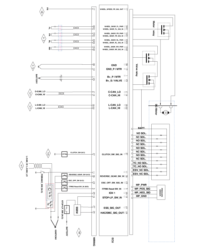 Функция TCS предотвращает проскальзывание колес в направлении движения, добавляя тормозное давление. и снижение крутящего момента двигателя по шине CAN. Функция TCS использует скорость вращения колеса. сигнал датчика для определения проскальзывания колеса до функции ABS.