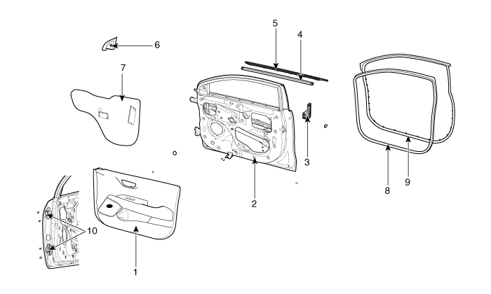 7. Уплотнитель обивки передней двери 8. Боковой уплотнитель передней двери 9. Боковой уплотнитель кузова передней двери 10. Петля передней двери |