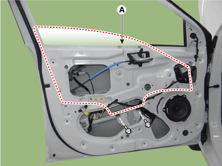Осторожно сдвиньте стекло передней двери (А) до упора крепления стекла. видны болты, затем ослабьте их.