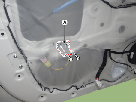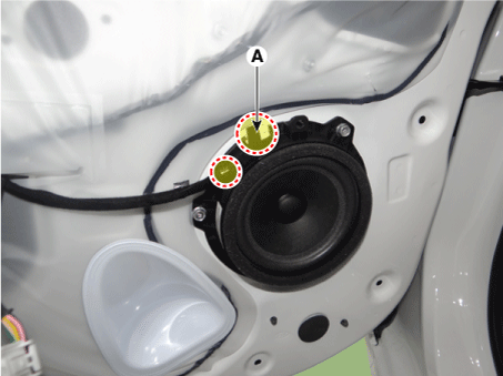 Отсоедините разъем динамика передней двери (А), а затем снимите клипсы крепления проводки.