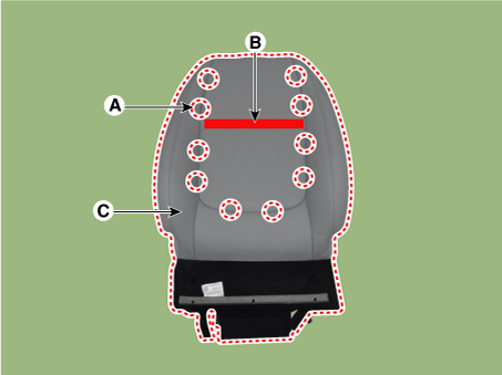 Снимите заднюю крышку переднего сиденья (C) с передней части каркаса спинки сиденья. после удаления ленты-липучки (A) и зажимов с кольцами (B).