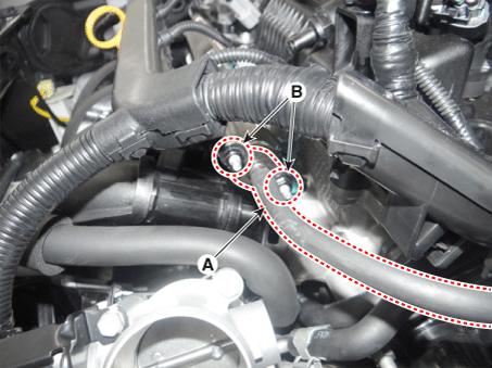 Снимите установочные гайки (В), а затем отсоедините трубку подачи топлива. (А).