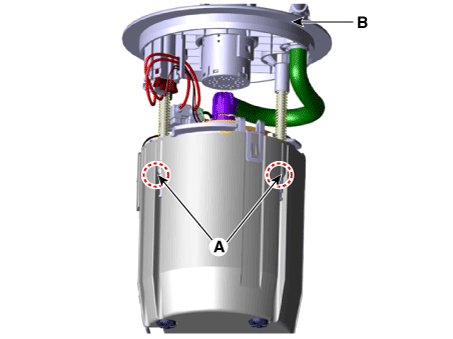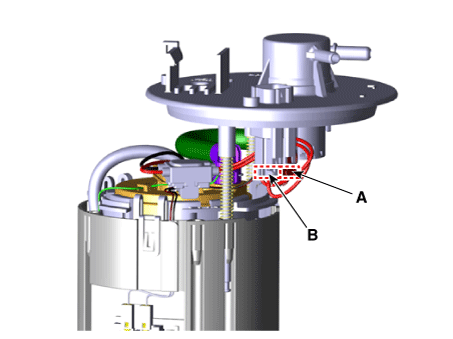 Отсоедините разъем электродвигателя топливного насоса (А) и разъем датчика уровня топлива. (Б).