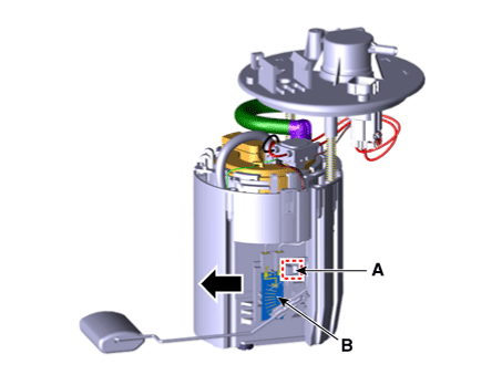 Нажмите на фиксирующий крюк (А) с помощью отвертки и снимите датчик уровня топлива. направление стрелки.