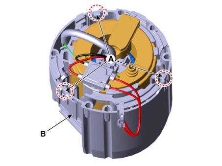 Снимите фиксирующий зажим трубки подушки (A), а затем отделите головку в сборе. (B) из чашки резервуара.