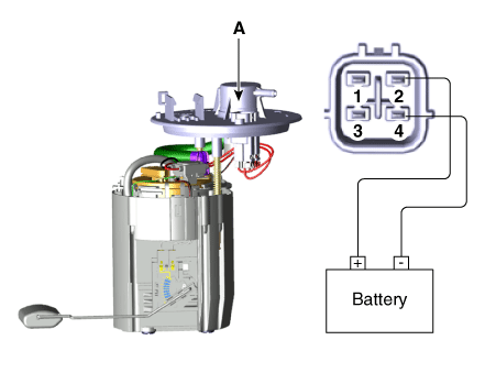 Проверьте работу двигателя, подключив разъем топливного насоса (A) к питанию (№ 2). и земля(№4)