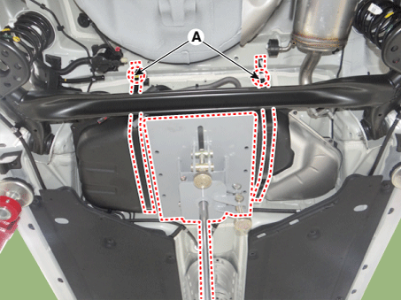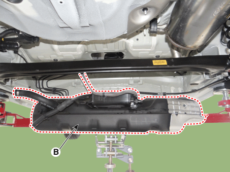 Поднимите автомобиль и поддержите топливный бак домкратом. |