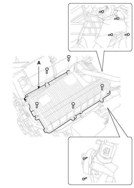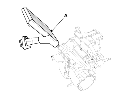 Снимите крышку радиатора отопителя (А) после ослабления крепежных винтов.
