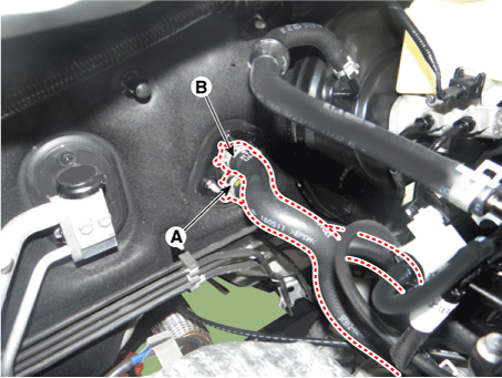 Отсоедините впускной (А) и выпускной (В) шланги отопителя от отопителя. единица.
