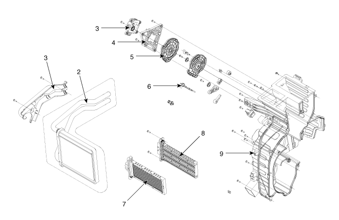 2. Дверь в сборе (TEMP) 3. Дверь в сборе (НОГА) 4. Дверь в сборе (ВЕНТ) 5. Дверь в сборе (DEF) 6. Сердечник испарителя 7. Фланец испарителя 8. Печать |
