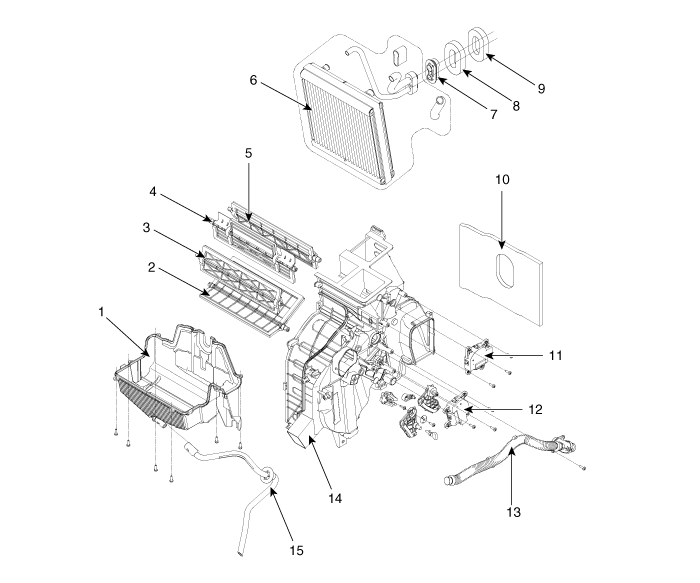 10. Пэд NVH 11. Активатор защиты от запотевания 12. Привод контроля температуры 13. Шланг аспиратора 14. Корпус отопителя (правый) 15. Сливной шланг |