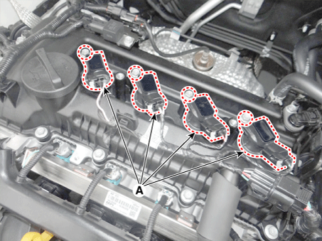 Снимите катушку зажигания (А), предварительно ослабив крепежные болты.