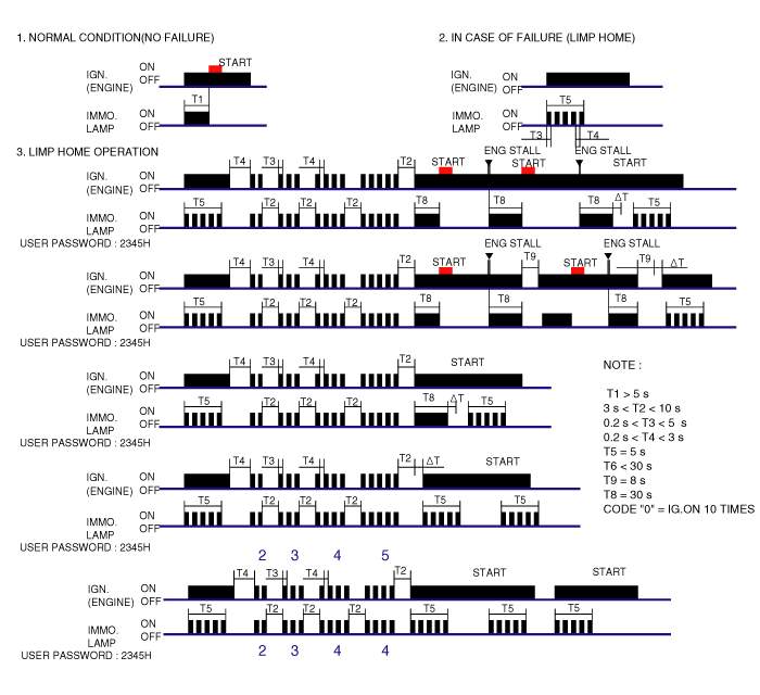 Хромой дом от ключа зажигания Limp Home можно активировать также с помощью ключа зажигания. Пароль пользователя могут быть введены в PCM (ECM) с помощью специальной последовательности включения/выключения зажигания. Только если PCM (ECM) находится в состоянии «обучения», а статус пароля пользователя "заученный" и пароль пользователя правильный, PCM (ECM) будет разблокирован. на некоторое время (30 сек.). В это время можно запустить двигатель. По прошествии времени, запуск двигателя невозможен. После ввода нового пароля таймер (30 сек.) начнется снова. После выключения зажигания PCM(ECM) блокируется, если таймер истек 8 секунды. Для следующего запуска запрашивается ввод пароля пользователя снова. |