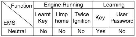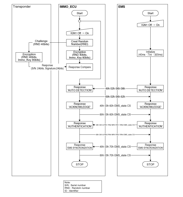 PCM(ECM) (A) выполняет проверку ключа зажигания с помощью специального алгоритм шифрования, который запрограммирован в транспондере, а также PCM (ECM) одновременно. Только если результаты равны, двигатель может быть начатым. Данные всех транспондеров, действительных для автомобиля, хранятся в PCM(ECM). Значение ERN (зашифрованное случайное число) между EMS и зашифрованной смартрой Устройство проверяется, и служба EMS определяет действительность закодированного ключа.