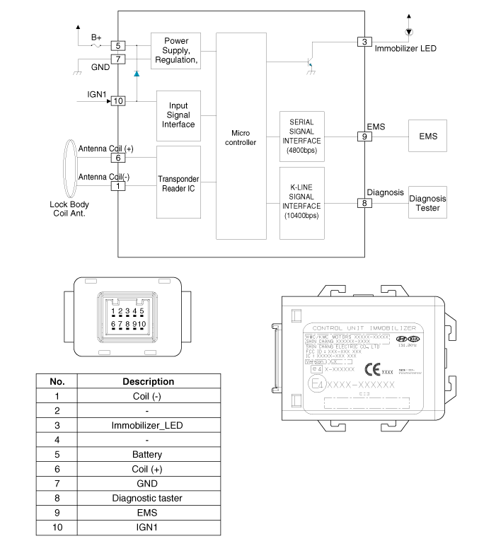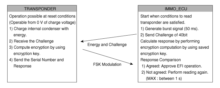 Радиочастотный сигнал от транспондера, принятый катушкой антенны, преобразуется в сообщения для последовательной связи устройством ИММОБИЛАЙЗЕР. И, полученный сообщения от PCM (ECM) преобразуются в радиочастотный сигнал, который передается к транспондеру через антенну.