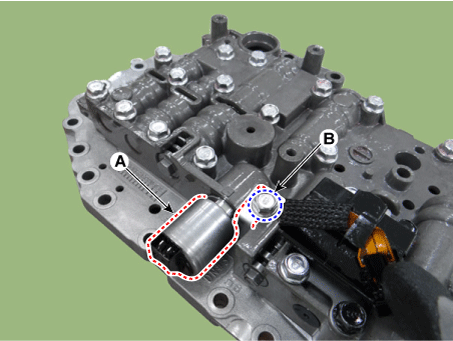Снимите электромагнитный клапан управления давлением в трубопроводе (А) после снятия опорный кронштейн, ослабив болт (B).