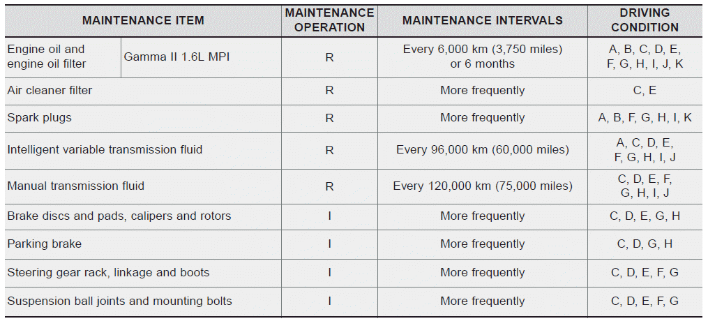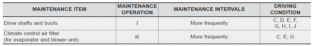 Следующие пункты должны обслуживаться чаще на автомобилях, обычно эксплуатируемых под тяжелые условия вождения. См. таблицу ниже для соответствующего технического обслуживания. интервалы.