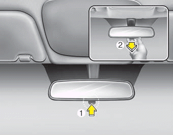 Потяните рычаг день/ночь на себя (2), чтобы уменьшить слепящий свет фар. транспортных средств позади вас во время ночного вождения.