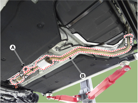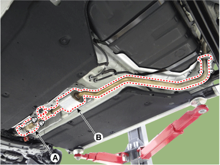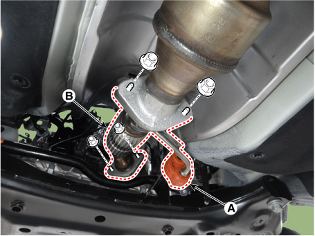 Снимите каталитический нейтрализатор и центральный глушитель (B).