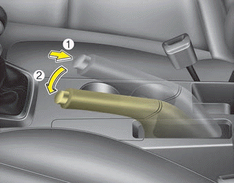 Чтобы отпустить стояночный тормоз, сначала включите ножной тормоз и поднимите стояночный тормоз. рычаг тормоза слегка. Во-вторых, нажмите кнопку разблокировки (1) и опустите парковочное рычаг тормоза (2), удерживая кнопку.
