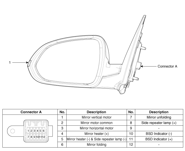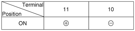 Подайте напряжение батареи на каждую клемму, как показано в таблице, и проверьте что зеркало работает нормально. [Управление зеркалом (левый/правый)]