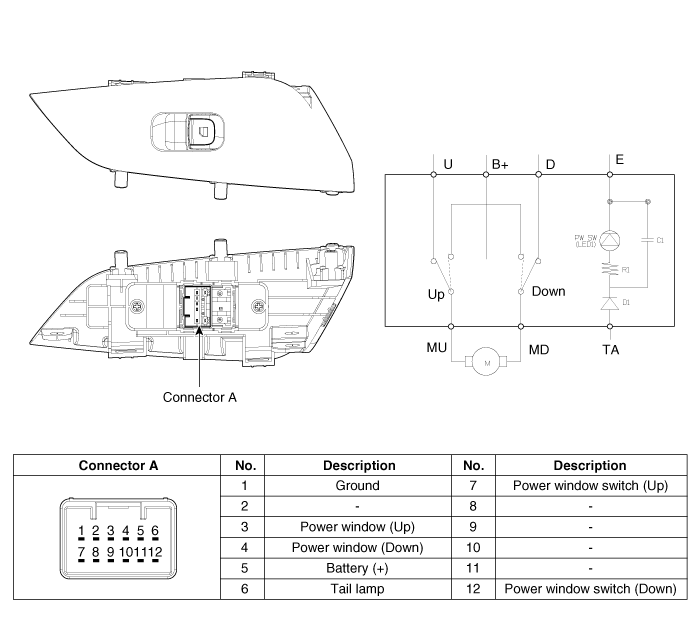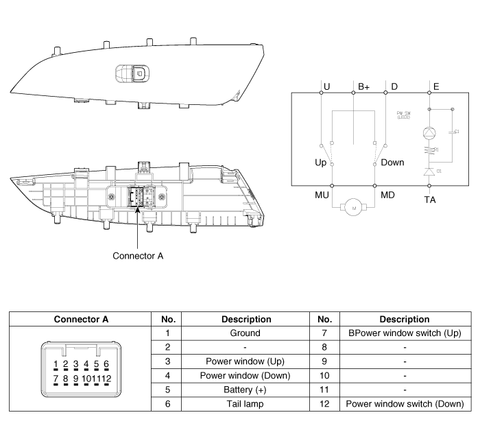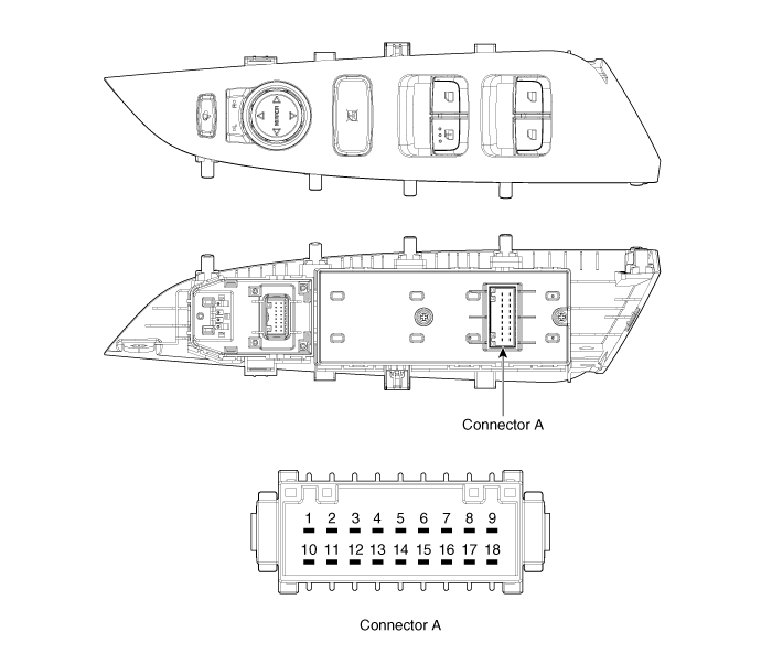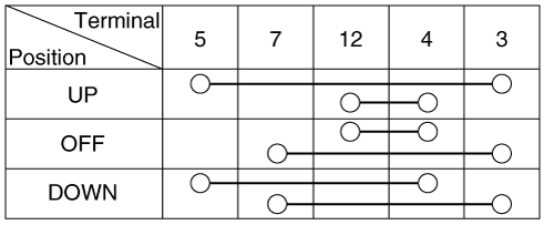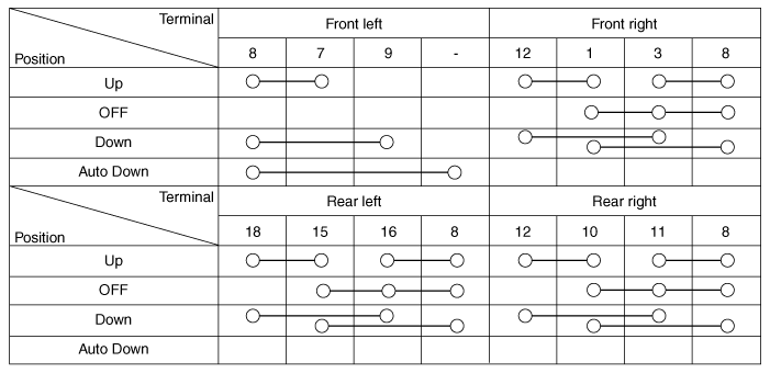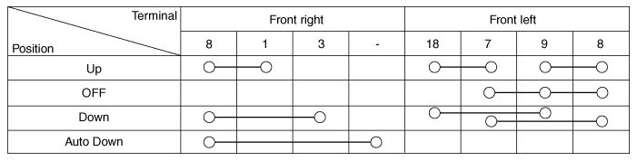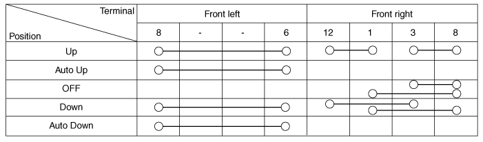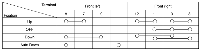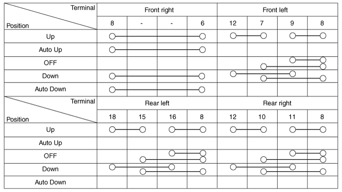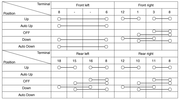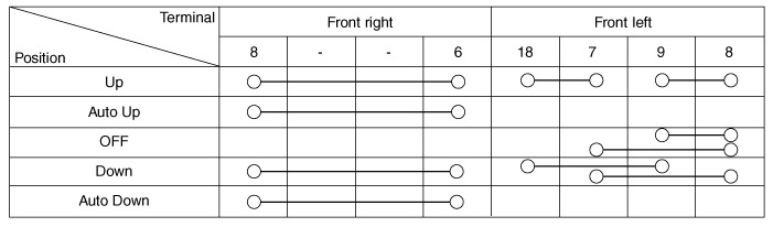 Проверьте целостность цепи между клеммами в каждом положении переключателя в соответствии с к столу. Если непрерывность не соответствует норме, замените переключатель. [Передний задний Безопасность водителя — автоматический подъем/опускание] (левый руль)