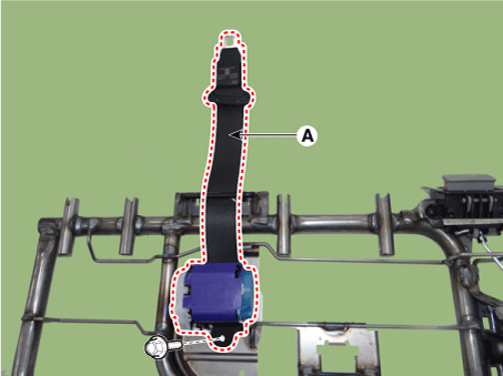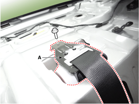 Снимите натяжитель ремня безопасности заднего центрального сиденья (А) после ослабления крепления. болт.